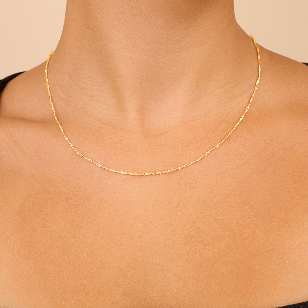 A subtle twist on a signature chain. This delicate rope-inspired design is so light you won’t even know it’s there. But catches all of the light. It’s an everyday piece with a quiet character.