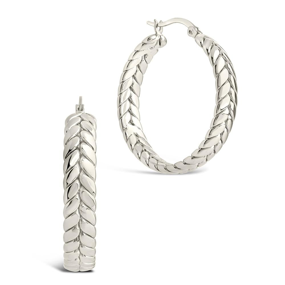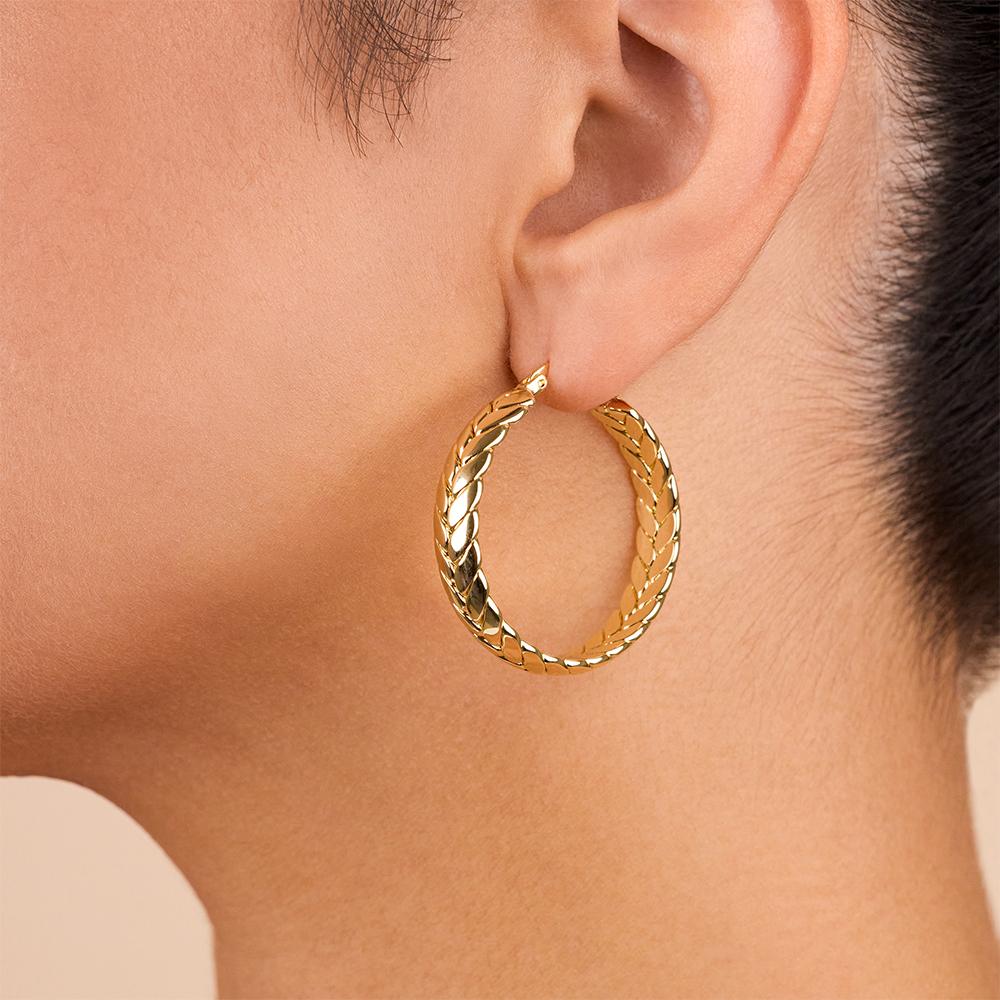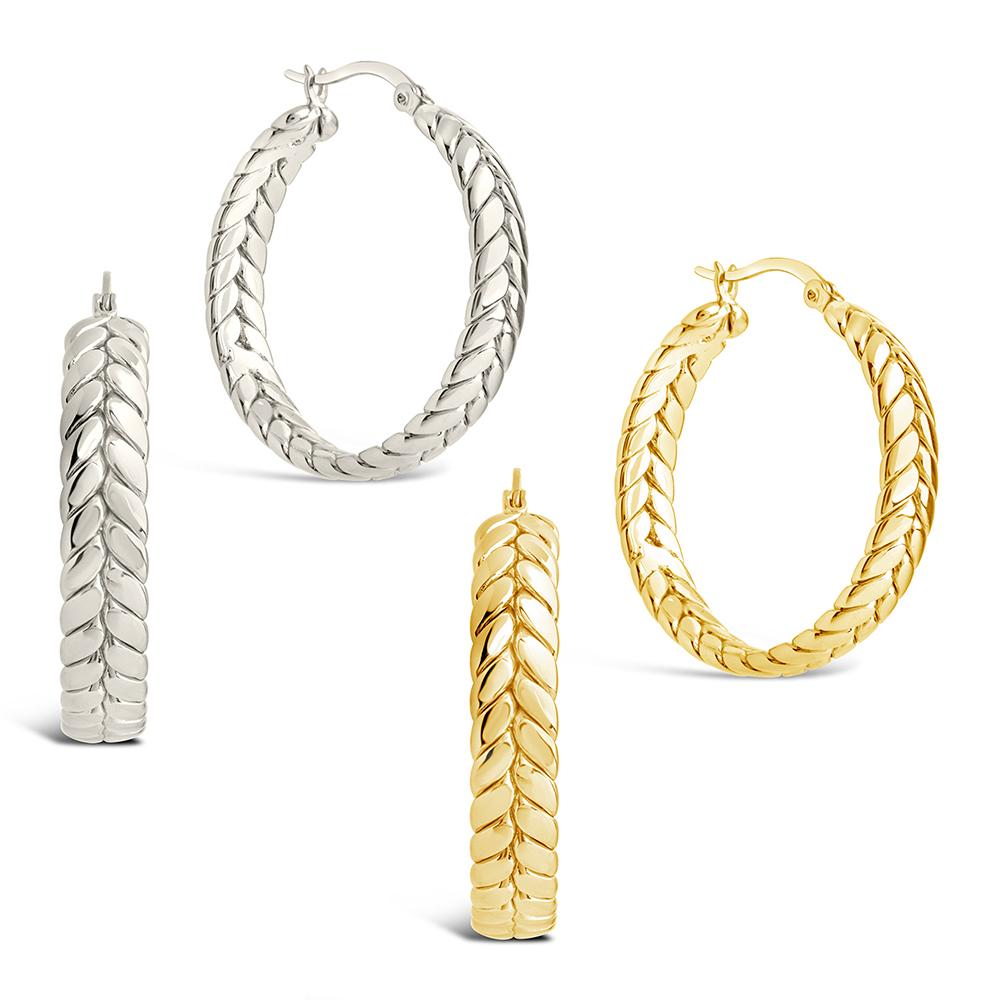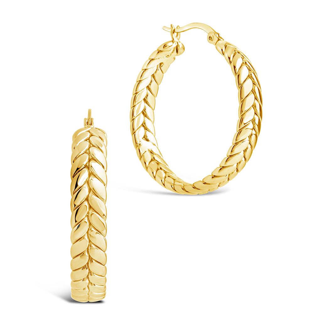 These hoops feature a bold, woven-inspired design with raised detailing that gives them dimension without feeling overdone. A nod to the classic herringbone pattern, reimagined with edge. Easy to style, hard to miss.