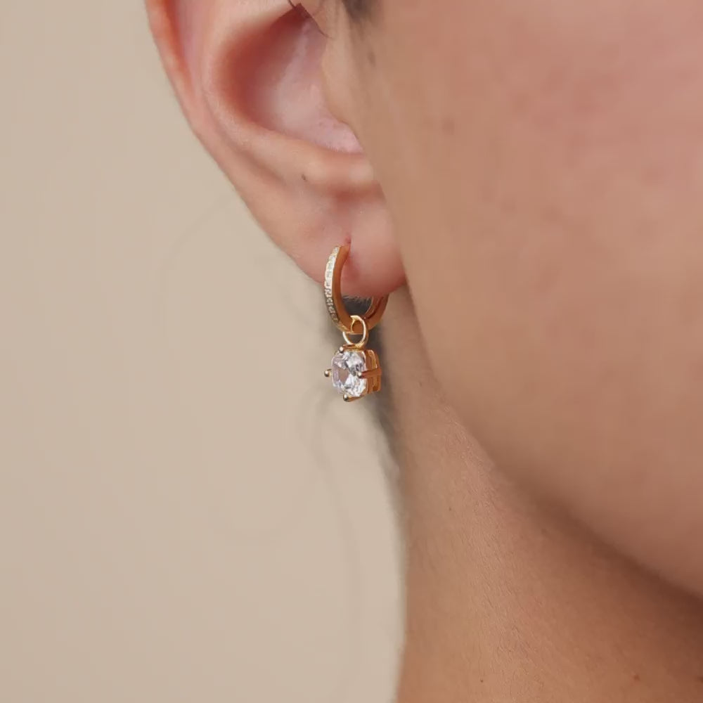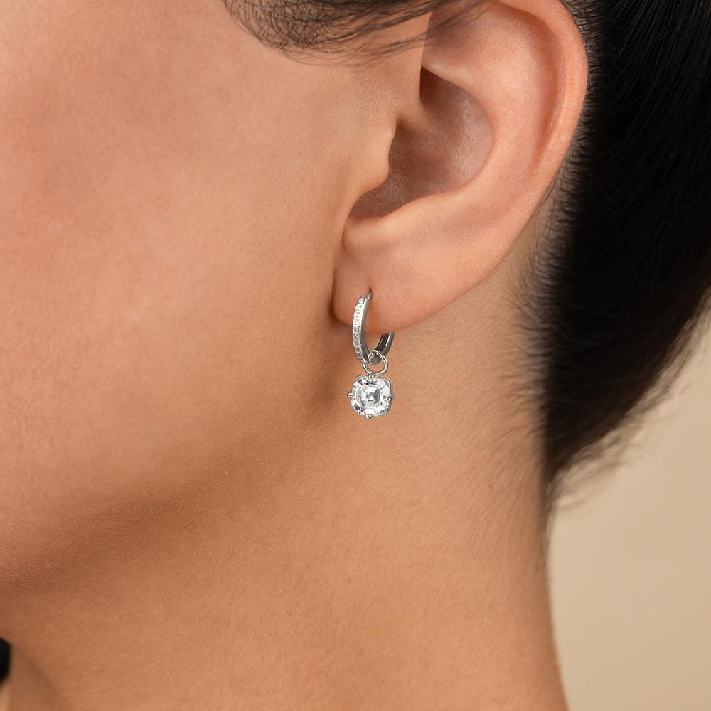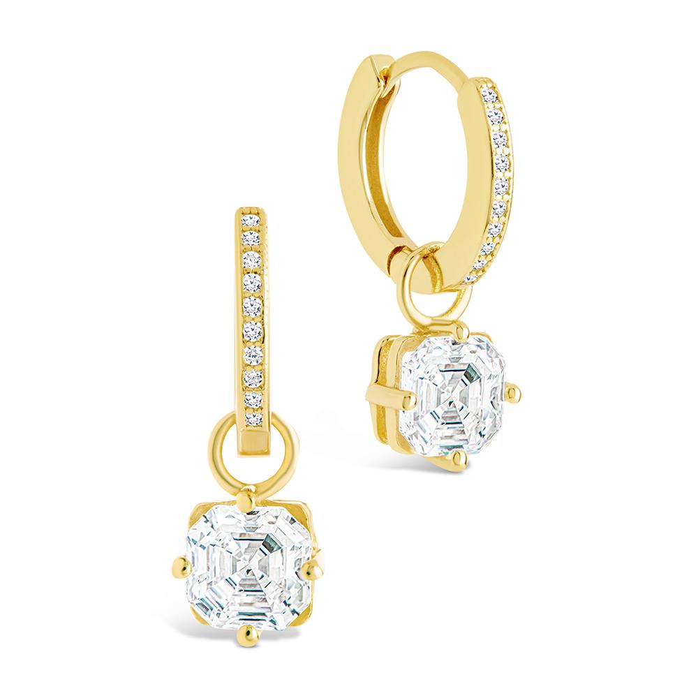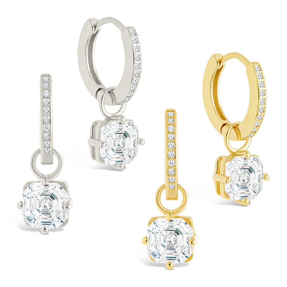 A little structure goes a long way. These sterling silver micro hoops feature a suspended Asscher-cut Hearts & Arrows CZ—cut for symmetry and clean angles. Subtle movement, strong lines.
