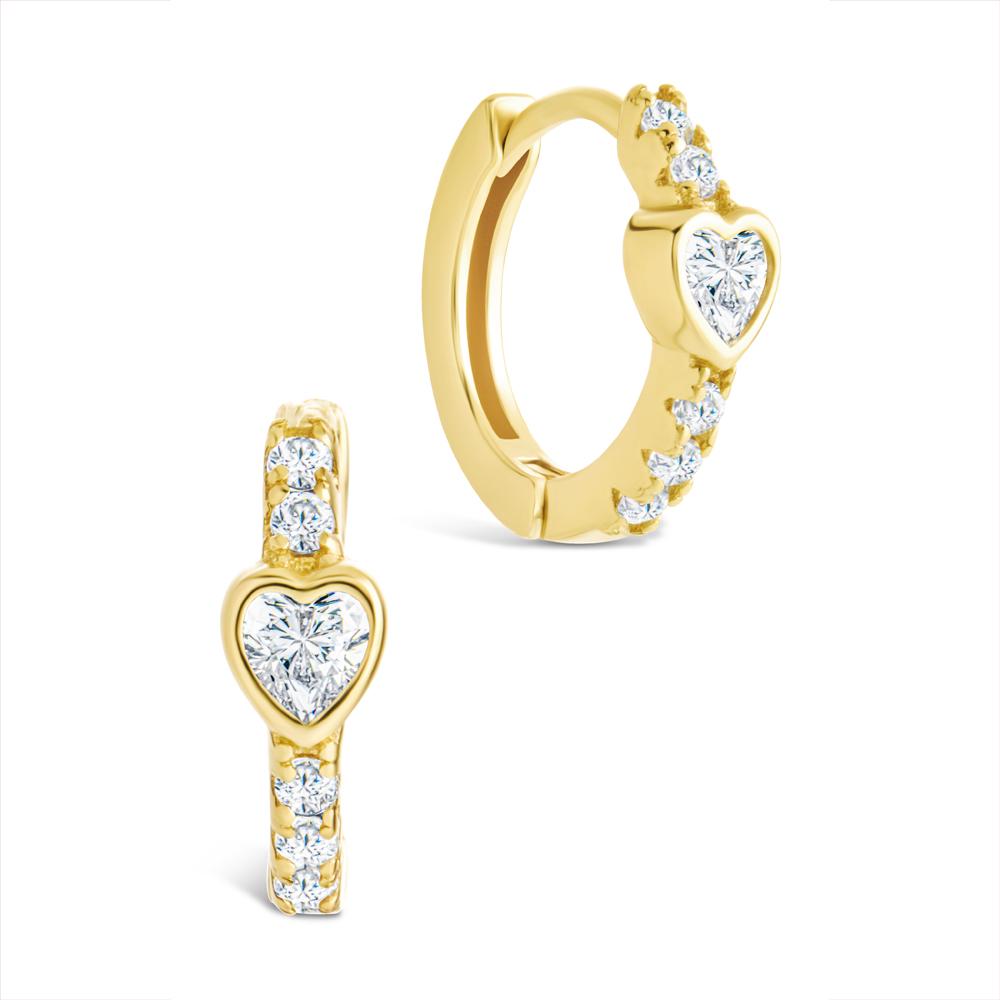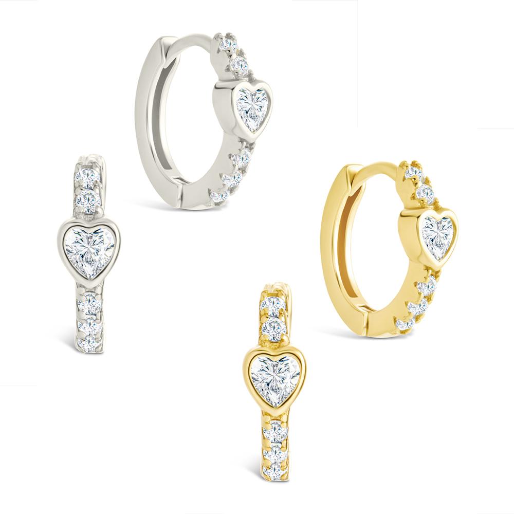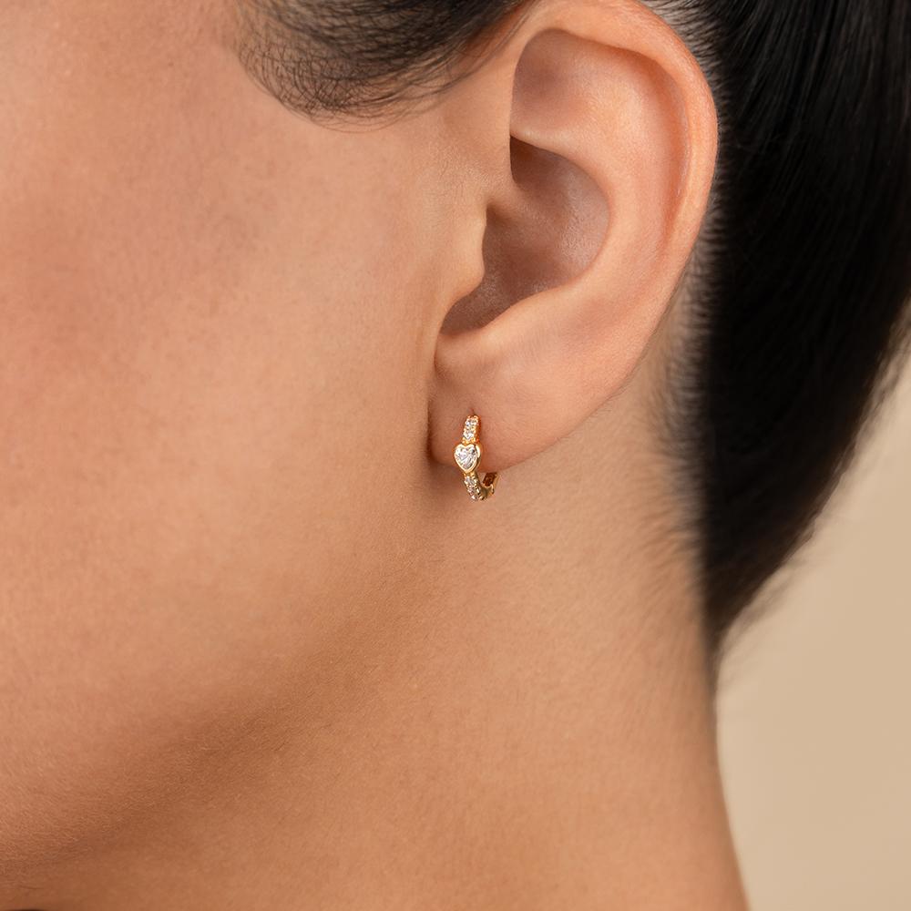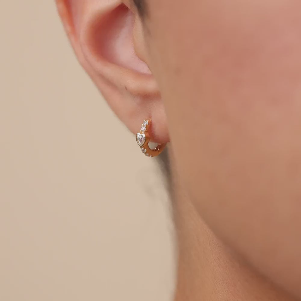 Cute, but with an edge. These heart-cut CZ huggies are bezel-set and lined with round stones—giving you sweet shimmer with a polished finish. Style them solo or layer with sleek studs for a more stacked moment.