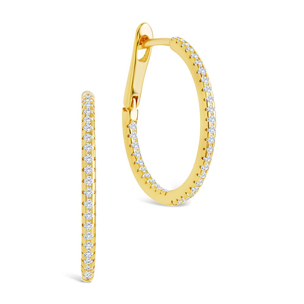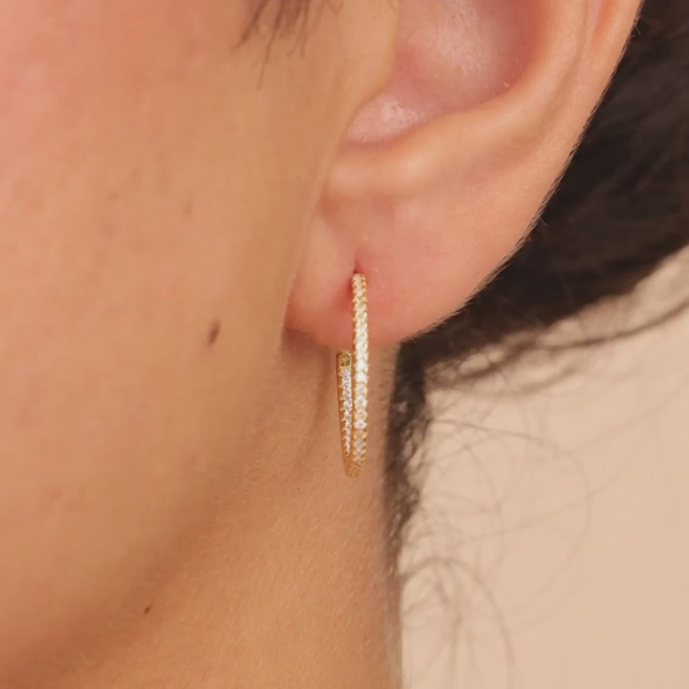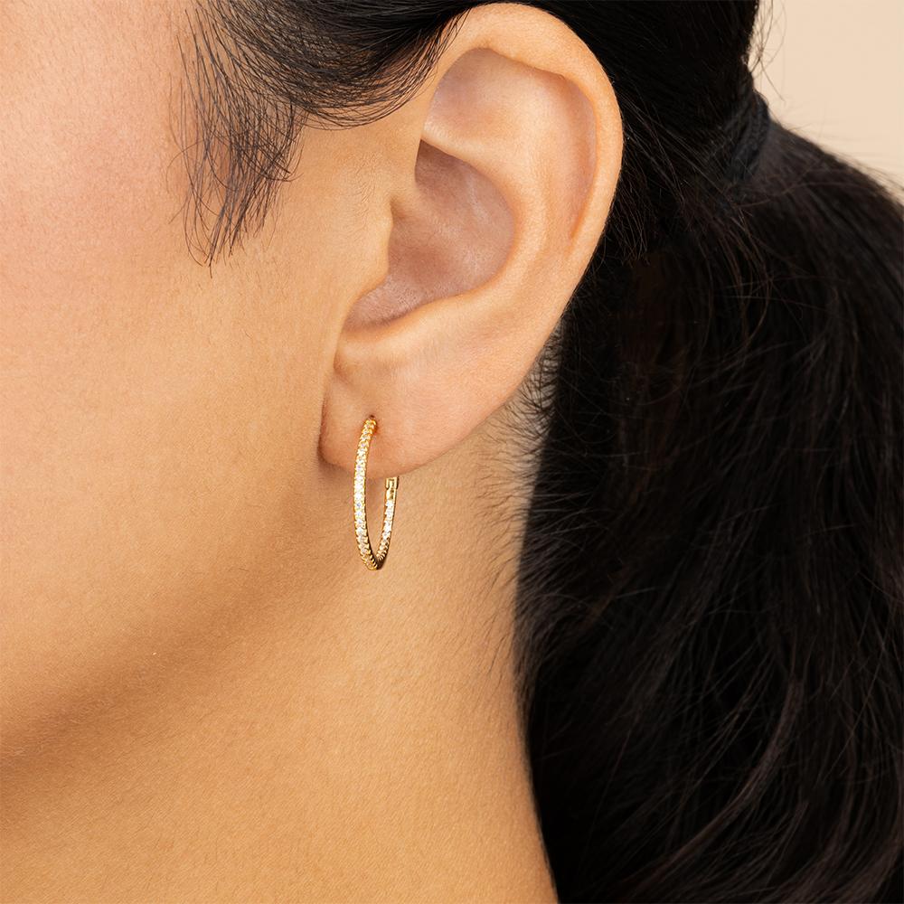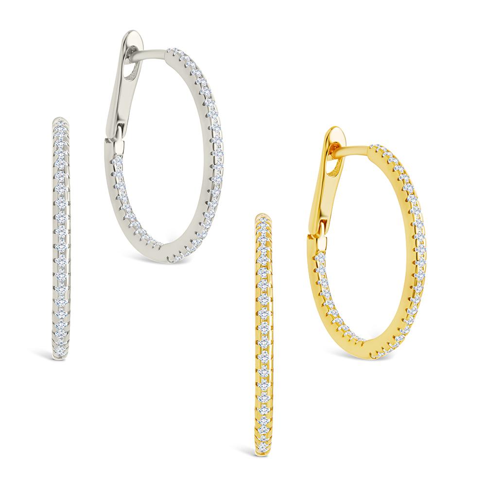 The Lilia CZ Infinity Hoops pack the punch from every angle. With Hearts & Arrows CZs set along the outside and inside of the sterling silver hoop, they hit the light no matter how you move. Finished with a secure lever-latch backing.