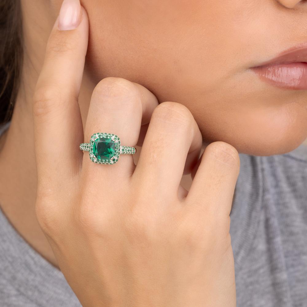Statement energy, all day. A bold cushion-cut green stone, framed in pavé, that turns heads and catches light. Glamorous, confident, and unapologetically vibrant.