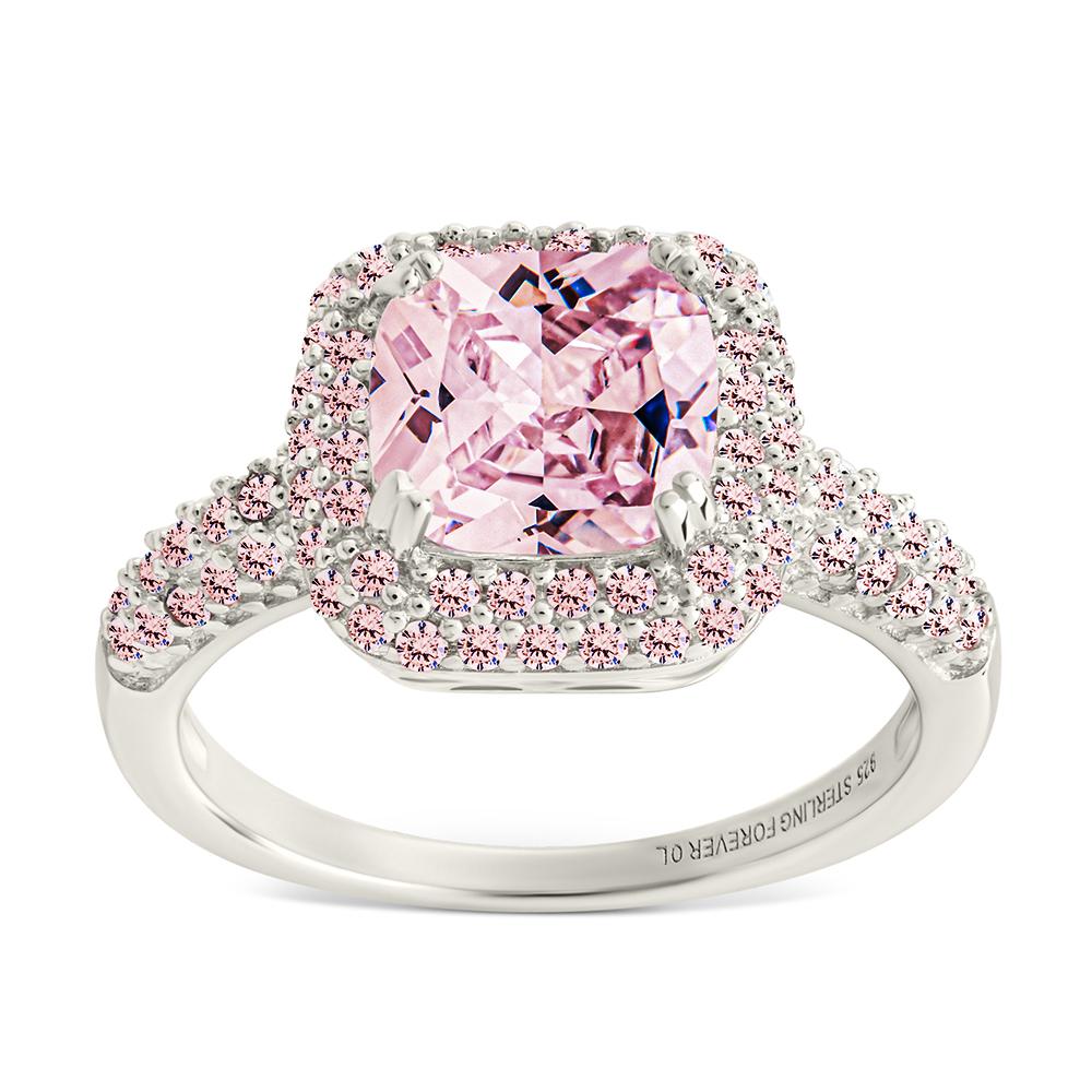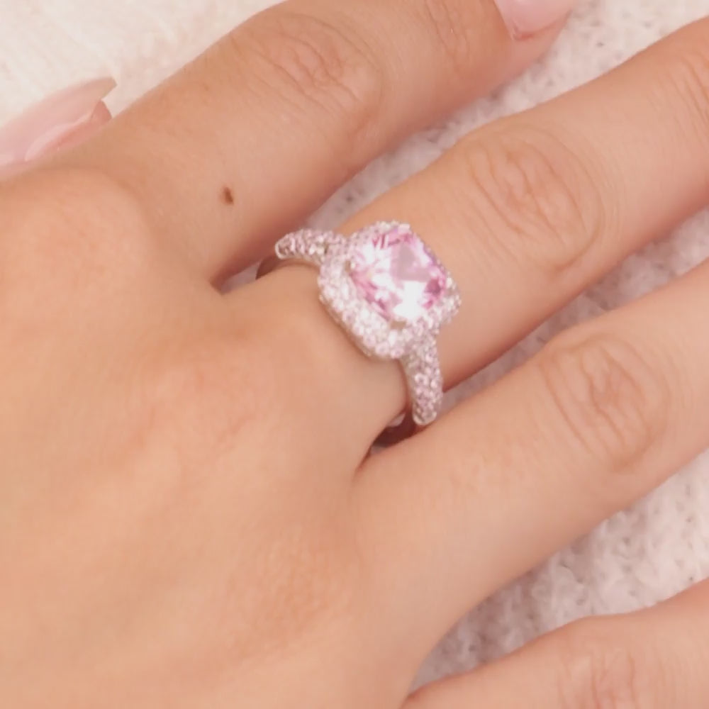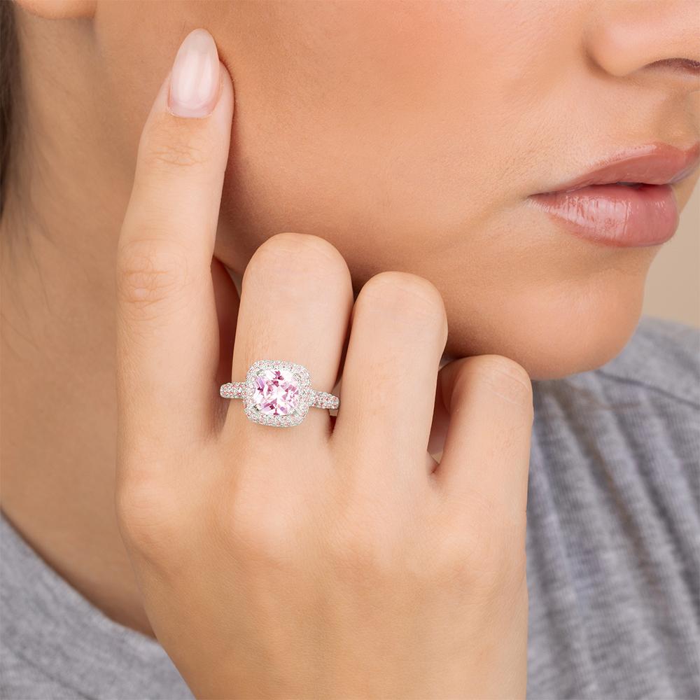 Pretty meets powerful. This cushion-cut pink stone is wrapped in a pavé halo and set to dazzle with every flick of your hand. A flirty finish with main-character energy.
