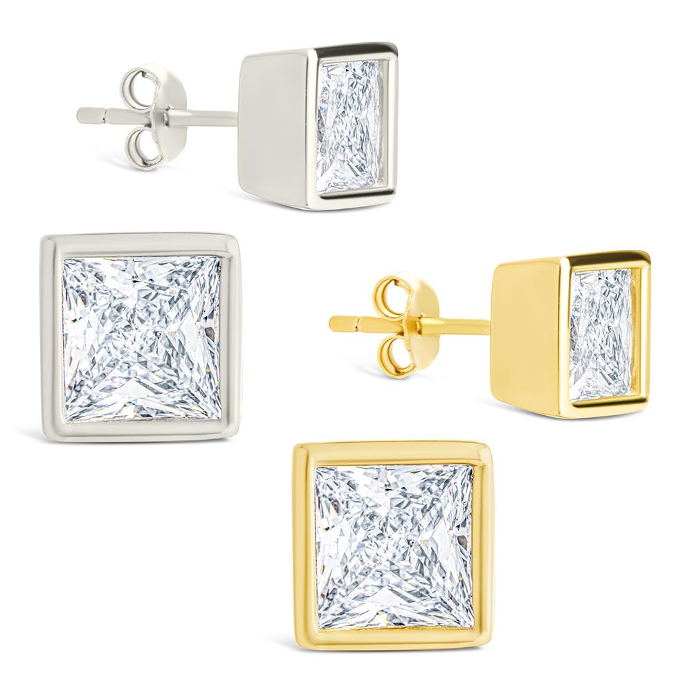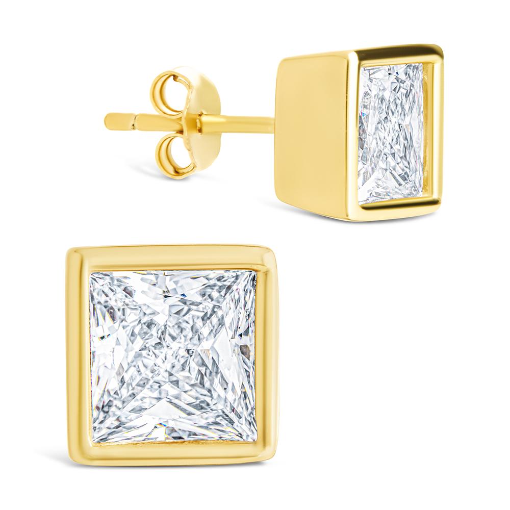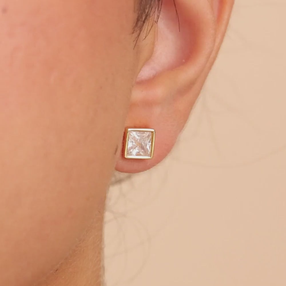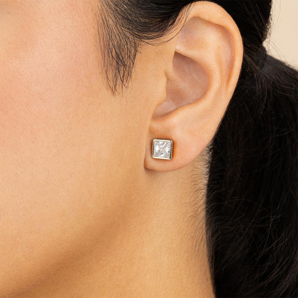 Simplicity with a bold twist. These studs feature Hearts & Arrows Princess cut stones for insane brilliance, they catch the light from every angle. Wrapped in a sleek, bezel setting and set in non-tarnishing sterling silver, they’re the perfect mix of classic and modern.